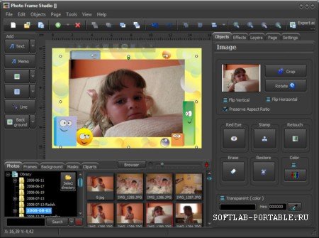 Программа, созданная для редактирования и декорации цифровых фотографий. Программа предлагает вам воспользоваться сотней шаблонов рамок для украшения, каждая их которых может быть изменена по вашим индивидуальным требованиям, включая фоновые цвета и изображения. Интерфейс программы был создан с уклоном на то, чтобы каждый пользователь смог без проблем воспользоваться этой программой. Вы сможете украсить ваши изображения с помощью добавления к ним разнообразных рамок, масок, фонов, теней или текста. Кроме того, вы сможете создать вашу собственную композицию шаблона для дальнейшего использования. Также данная программа позволяет вам производить калибровку изображений, включая обрезку и увеличение изображений, а также удаление эффекта красных глаз.
